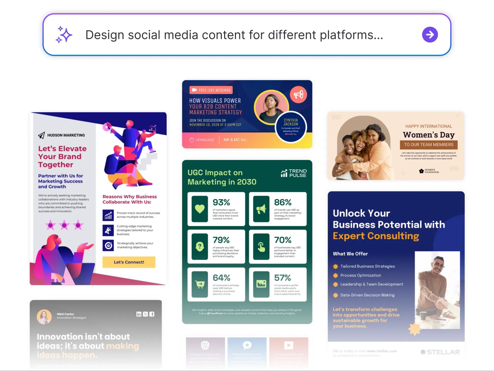 Between running the business and managing socials, time’s tight. Venngage’s Social Media Content Generator helps you create professional, brand-aligned posts quickly—no copywriting or design skills required.