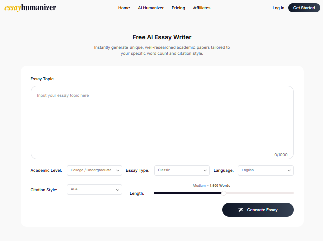 - Essay generation: Creates complete, structured essays from simple prompts or topics.