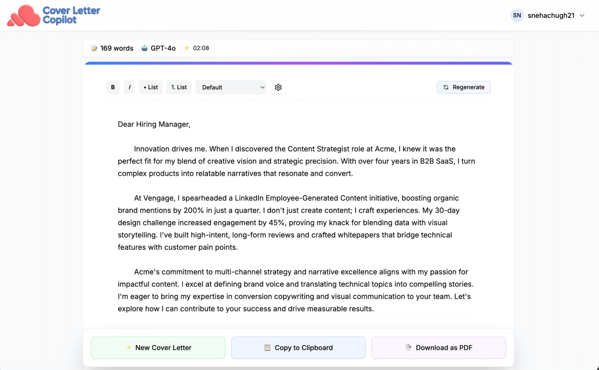 - Detailed content: Generates full-page letters with more depth than most competitors.